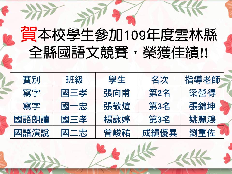 109年雲林縣國語文競賽得獎名單