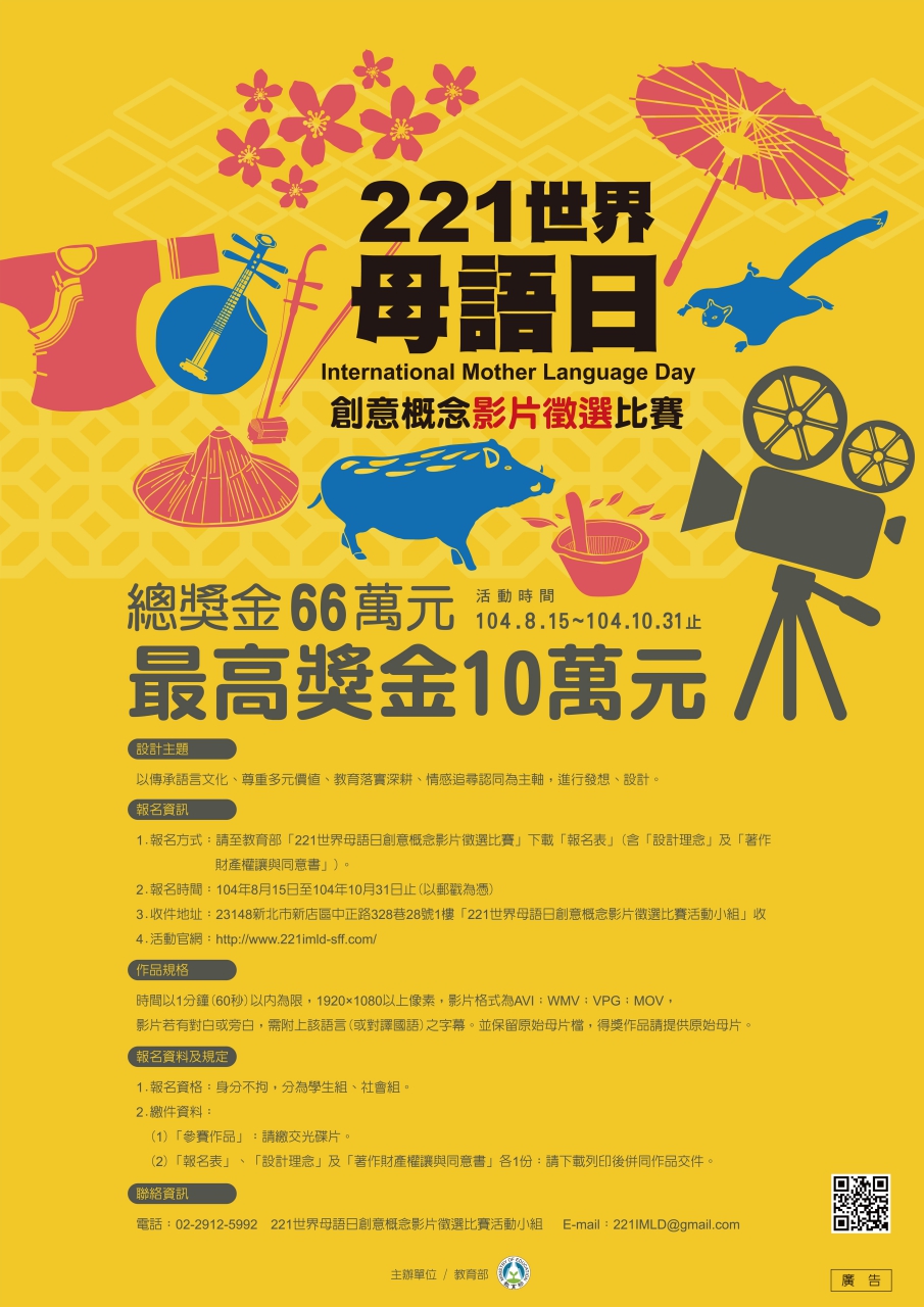 二、本活動分為學生組及社會組,相關資訊請洽詢「221世界母語日創意概念影片徵選活動小組」,參賽作品請於104年10月31日前(以郵戳為憑)郵寄至:231新北市新店區中正路328巷28號1樓,聯絡電話:02-2921-5992,電子信箱:221IMLD@gmail.com。